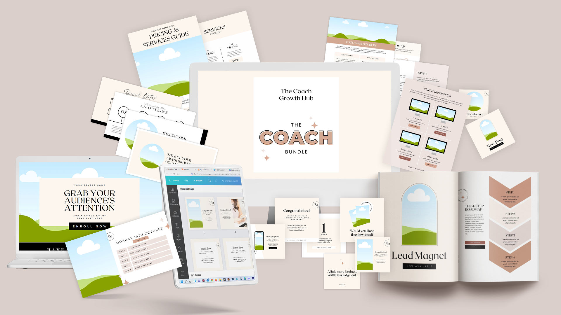 ONE TIME OFFER $37: Save over $60 (normal price $97) on our bestselling coach graphic template bundle that comes with lead magnet templates, pinterest launch pins, group banners, email newsletter headers, business plan template, workbook template, landing page templates, quick link template, email signature template, social post templates, launch post templates, event covers, presentation slide deck templates, onboarding guide, quote posts and a pricing and service template. All templates can be edited with the FREE version of the online graphic design tool CANVA.
